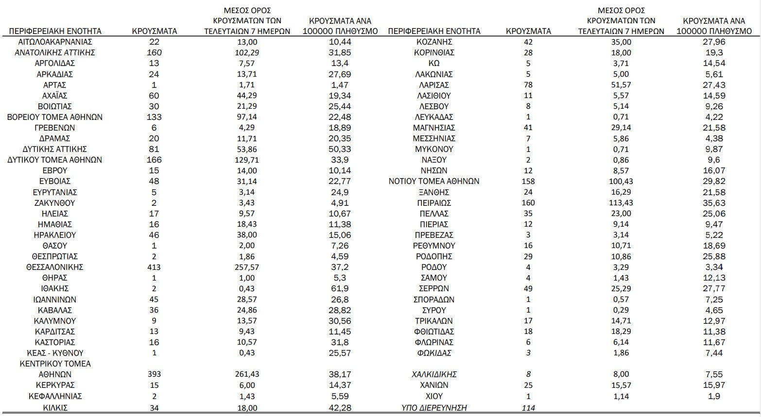 Η κατανομή νέων εγχώριων κρουσμάτων στον παρακάτω πίνακα