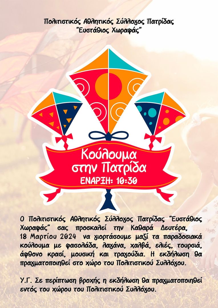 Ο Πολιτιστικός Αθλητικός Σύλλογος Πατρίδας «Ευστάθιος Χωραφάς» σας προσκαλεί την Καθαρά Δευτέρα, 18 Μαρτίου 2024 στις 10:30 π.μ., να γιορτάσουμε μαζί τα παραδοσιακά κούλουμα με φασολάδα, λαγάνα, χαλβά, ελιές, τουρσιά, άφθονο κρασί, μουσική και τραγούδια. Η εκδήλωση θα πραγματοποιηθεί στο χώρο του Πολιτιστικού Συλλόγου.
