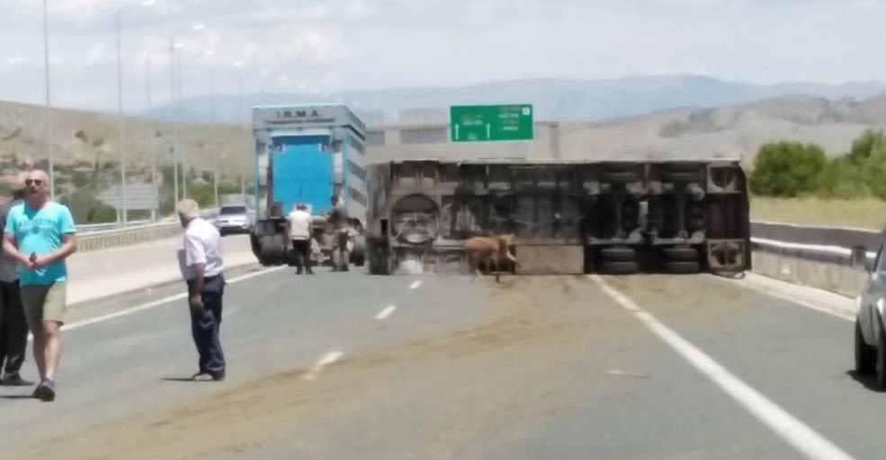 Σύμφωνα με αυτόπτη μάρτυρα, «Έσκασε το λάστιχο της νταλίκας και έφυγε αριστερά στο στηθαιο. Δίπλα ήταν και ένα άλλο φορτηγό αλλά αυτό έμεινε όρθιο. Οι οδηγοί είναι και οι δύο καλά. Μια, αγελάδα είναι τραυματισμενη αρκετά. Κάποια ελαφριά και κάποια ζώα έφυγαν και προσπαθεί η αστυνομία να τα μαζέψει από την Εγνατία. Έτσι έκλεισαν και τα δύο ρεύματα για να μην γίνει και στο άλλο ρεύμα ατυχία από τα ζώα και από τα τσιμέντα που εκσενδονιστηκαν».