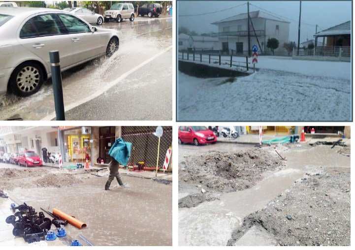 Δέκα λεπτά ήταν αρκετά για να γίνουν οι δρόμοι ποτάμια από το ξαφνικό μπουρίνι που ξέσπασε χθες λίγο πριν τις 2 το μεσημέρι στην περιοχή μας, λίγο πριν την εκπνοή του Απριλίου, με δυνατό αέρα στην αρχή και με έντονη βροχή και χαλάζι στη συνέχεια, τόσο μέσα στη Βέροια, όσο και σε πολλές περιοχές της Ημαθίας και του κάμπου. Η μεγάλη αγωνία αφορά στους αγρότες και στις παραγωγές που κι αυτές χτυπήθηκαν από το χαλάζι και όπως λένε ενδεικτικά οι αγρότες το χαλάζι στο Λουτρό είχε μέγεθος ελιάς, ενώ έντονη χαλαζόπτωση παρατηρήθηκε στη Μέση, στο Παλιό Σκυλίτσι, στο Βρυσάκι, στην Αλεξάνδρεια, στην Πατρίδα, στην Βεργίνα και στα χωριά των Πιερίων, σε Τρίλοφο, Στενήμαχο, κ.α. Μάλιστα στη Συκιά το χαλάζι άσπρισε τους δρόμους (φωτο) που θύμιζαν βαρύ χειμώνα και οι αγρότες, περιμένουν τον ΕΛΓΑ…! Όπως μας είπαν εκπρόσωποι των αγροτών, περιμένουν να βγουν σήμερα που θα ανοίξει ο καιρός, στα χωράφια τους για να δουν τα αποτελέσματα της καταιγίδας και κάνουν για κάνουν για μια φορά ακόμα λόγο, για ανάγκη άμεσης καταγραφής των ζημιών, από τους γεωπόνους.