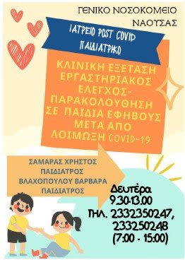 Η Διοίκηση του Νοσοκομείου Νάουσας ενημερώνει τους πολίτες του Δήμου Νάουσας και της ευρύτερης περιοχής του Νομού Ημαθίας ότι ξεκινάει η λειτουργία ΠΑΙΔΙΑΤΡΙΚΟΥ “Post Covid” Ιατρείου στην Υγειονομική Μονάδα Νάουσας, από τη Δευτέρα 6-6-2022.