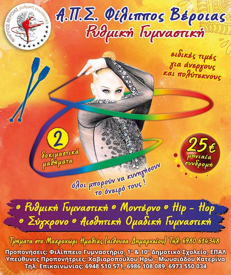 Μετά από 5 χρόνια σκληρής και συστηματικής δουλειάς , γεμάτα χορό ,επιδείξεις ,παραστάσεις και αγώνες , γεμάτα επιτυχίες και μετάλλια ,το τμήμα ΡΥΘΜΙΚΗΣ και Αισθητικής ομαδικής γυμναστικής του ιστορικού συλλόγου Α.Π.Σ «ΦΙΛΙΠΠΟΣ ΒΕΡΟΙΑΣ» συνεχίζει με αμείωτο κέφι και όραμα και προσκαλεί όλα τα παιδιά από 3,5 έως 18 ετών να ανακαλύψουν την ομορφιά αυτού του τόσο ξεχωριστού αθλήματος αλλά και την χαρά του χορού μέσα από τμήματα hip hop ,σύγχρονου και μοντέρνου χορού!!! Γιατί ΌΛΟΙ μπορούν να κυνηγήσουν το όνειρό τους!!!!!!!