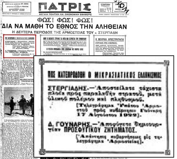Στις 17 Αυγούστου 1922, όταν είχε αρχίσει η κατάρρευση του μετώπου, ο Ύπατος Αρμοστής Σμύρνης Αριστείδης Στεργιάδης έστειλε τηλεγράφημα στην κυβέρνηση των Αθηνών: «Αποστείλατε τάχιστα πλοία προς παραλαβήν στρατού μετά υλικού πολέμου και του πληθυσμού». Την επόμενη μέρα ο πρωθυπουργός Δ. Γούναρης του απάντησε: «Αποφύγετε δημιουργία προσφυγικού ζητήματος». Το γεγονός επιβεβαίωσε ο ίδιος ο Αριστείδης Στεργιάδης σε συνέντευξή του στην εφημερίδα ΠΑΤΡΙΣ, φύλλα από 5 έως 13 Ιανουαρίου 1930.