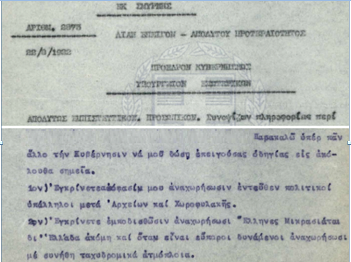 Πέντε ημέρες πριν την είσοδο του κεμαλικού στρατού στη Σμύρνη (στις 22 Αυγούστου με το παλαιό ημερολόγιο) ο Αριστείδης Στεργιάδης απέστειλε προς την ελληνική κυβέρνηση (Πέτρου Πρωτοπαπαδάκη) τηλεγράφημα με το οποίο ζητούσε εντολές, αφού πρώτα παρέθετε κάποιες προτάσεις. Μια από αυτές (η 2η σε σειρά) ήταν: «Εγκρίνετε εμποδισθώσι αναχωρίσωσι Έλληνες Μικρασιάται δι’ Ελλάδα, ακόμα και όταν είναι εύποροι δυνάμενοι αναχωρήσωσι με συνήθη ταχυδρομικά ατμόπλοια». Για να λάβει την ίδια ημέρα την έγκριση του Έλληνα Πρωθυπουργού: «Εις απάντησιν υμετέρου υπ’ αριθ. 2873 συμφωνούμεν μεθ’ υμών εις τα σημεία 1ον 2ον 3ον …»