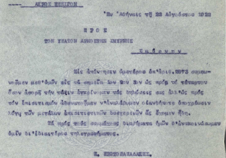 Τηλεγράφημα του Ύπατου Αρμοστή Σμύρνης Αριστείδη Στεργιάδη προς τον Έλληνα