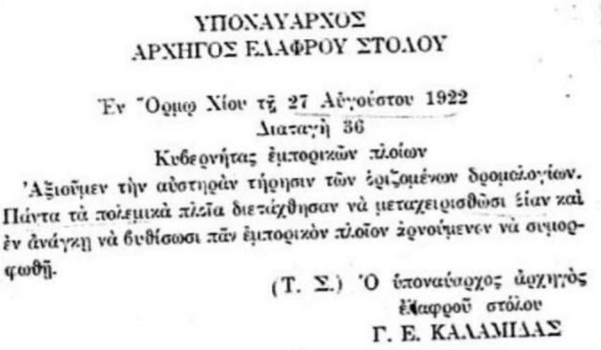 Η διαταγή υπ αριθμ. 36 του Αρχηγού Ελαφρού Στόλου Γ. Καλαμίδα