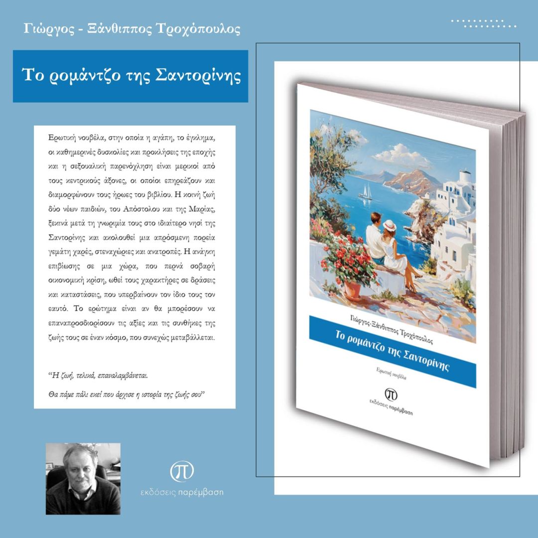 Μόλις κυκλοφόρησε η ερωτική νουβέλα «Το ρομάντζο της Σαντορίνης» του Γιώργου-Ξάνθιππου Τροχόπουλου από τις Εκδόσεις Παρέμβαση. Η αγάπη, το έγκλημα, οι καθημερινές δυσκολίες και προκλήσεις της εποχής και η σεξουαλική παρενόχληση είναι μερικοί από τους κεντρικούς άξονες του έργου, οι οποίοι επηρεάζουν και διαμορφώνουν τους ήρωες του βιβλίου. Η κοινή ζωή δύο νέων παιδιών, του Απόστολου και της Μαρίας, ξεκινά μετά τη γνωριμία τους στο ιδιαίτερο νησί της Σαντορίνης και ακολουθεί μια απρόσμενη πορεία γεμάτη χαρές, στεναχώριες και ανατροπές. Η ανάγκη επιβίωσης σε μια χώρα, που περνά σοβαρή οικονομική κρίση, ωθεί τους χαρακτήρες σε δράσεις και καταστάσεις, που υπερβαίνουν τον ίδιο τους τον εαυτό. Το ερώτημα είναι αν θα μπορέσουν να επαναπροσδιορίσουν τις αξίες και τις συνθήκες της ζωής τους σε έναν κόσμο, που συνεχώς μεταβάλλεται.