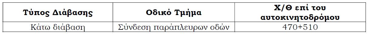 – Την τοπική στένωση οδοστρώματος (όταν το εναπομείναν πλάτος κυκλοφορίας είναι τουλάχιστον 5,50 μ.) ή εναλλακτικά, τον εναλλάξ τοπικό αποκλεισμό της λωρίδας κυκλοφορίας της μίας κατεύθυνσης, με ταυτόχρονη εκ περιτροπής κυκλοφορία των οχημάτων των δύο ρευμάτων από τη λωρίδα κυκλοφορίας της άλλης κατεύθυνσης, καθημερινά από την ανατολή έως τη δύση του ηλίου, στην ακόλουθη κάτω διάβαση του αυτοκινητόδρομου: