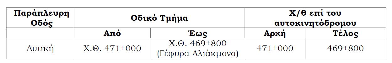 – Την τοπική στένωση οδοστρώματος (όταν το εναπομείναν πλάτος κυκλοφορίας είναι τουλάχιστον 5,50 μ.) ή εναλλακτικά, τον εναλλάξ τοπικό αποκλεισμό της λωρίδας κυκλοφορίας της μίας κατεύθυνσης, με ταυτόχρονη εκ περιτροπής κυκλοφορία των οχημάτων των δύο ρευμάτων από τη λωρίδα κυκλοφορίας της άλλης κατεύθυνσης, καθημερινά από την ανατολή έως τη δύση του ηλίου, στο ακόλουθο τμήμα των παράπλευρων οδών του αυτοκινητόδρομου: