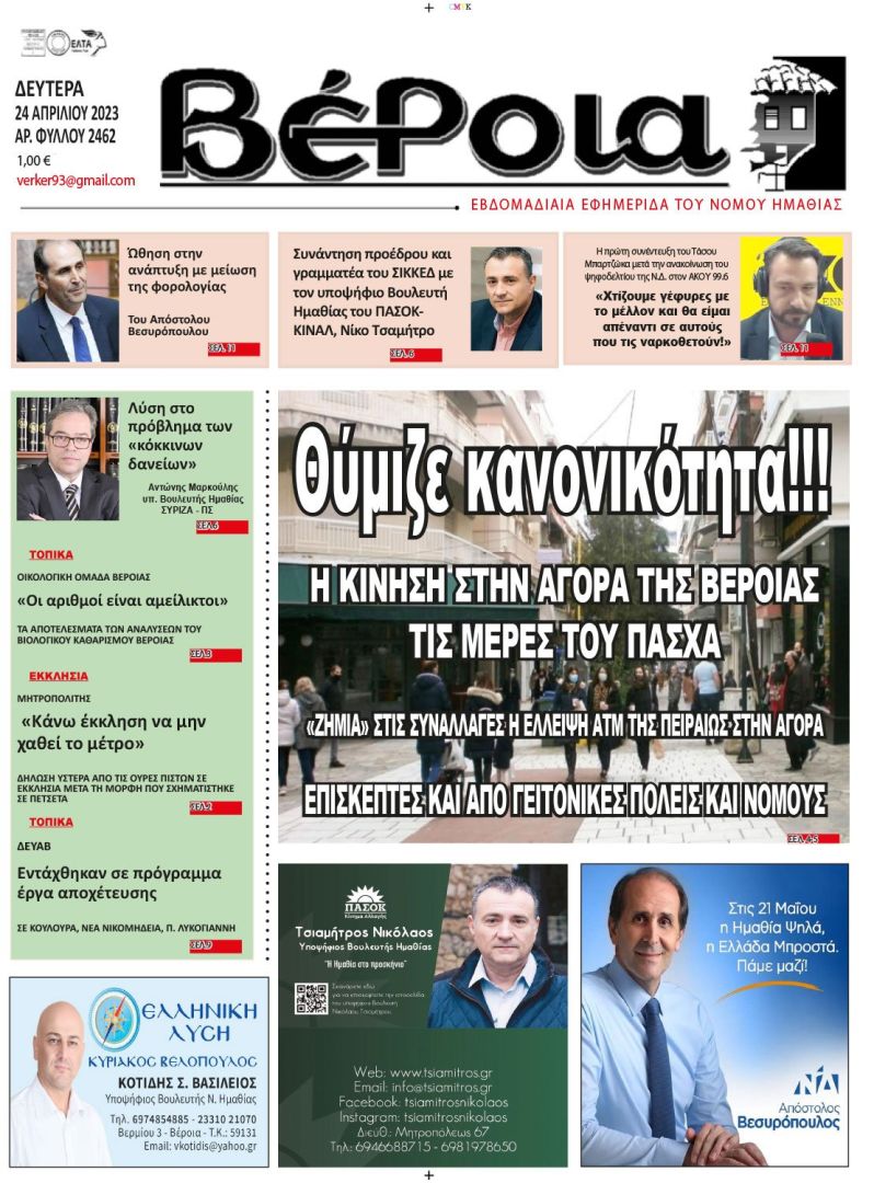 Κυκλοφορούν αύριο οι εφημερίδες ΒΕΡΟΙΑ – ΚΕΡΚΙΔΑ (24/4/2023)