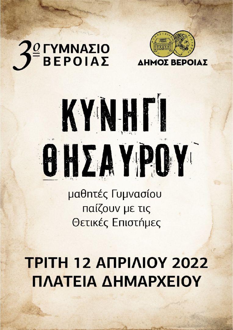 Το 3ο Γυμνάσιο Βέροιας με την υποστήριξη του Δήμου Βέροιας διοργανώνει την Τρίτη 12 Απρίλιου από τις 10:00 π.μ. στην πλατεία Δημαρχείου, μαθητικό διαγωνισμό με τίτλο «Κυνήγι Θησαυρού». Ο διαγωνισμός απευθύνεται σε μαθητές και μαθήτριες που φοιτούν κατά το σχολικό έτος 2021-2022 στην Γ΄ Γυμνασίου και οι δηλώσεις συμμετοχής σχολείων έχουν ήδη συγκεντρωθεί από το 3ο Γυμνάσιό Βέροιας. Ο διαγωνισμός θα βασίζεται σε γνώσεις αλλά κυρίως σε δεξιότητες που έχουν αποκτήσει μαθητές και μαθήτριες της Γ΄ Γυμνασίου στα μαθήματα των Θετικών Επιστημών (Φυσική, Χημεία, Βιολογία, Μαθηματικά).