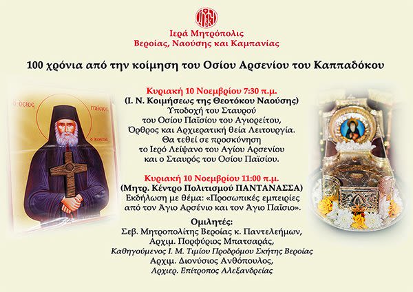 Την Κυριακή 10 Νοεμβρίου στις 11:00 π.μ. στο Μητροπολιτικό Κέντρο Πολιτισμού ΠΑΝΤΑΝΑΣΣΑ στη Νάουσα θα πραγματοποιηθεί εκδήλωση με θέμα «Προσωπικές εμπειρίες από τον Άγιο Αρσένιο και τον Άγιο Παΐσιο», με την ευκαιρία της συμπληρώσεως 100 ετών από την κοίμηση του Αγίου Αρσενίου και 30 ετών από την κοίμηση του Αγίου Παϊσίου.