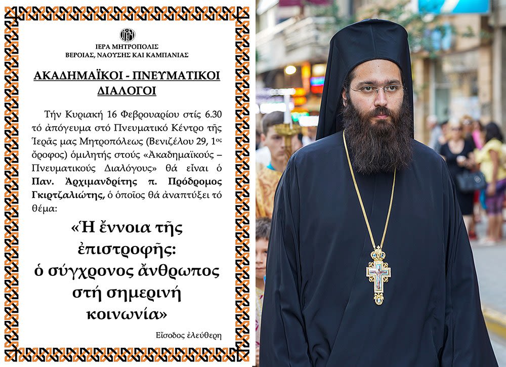 Τήν Κυριακή 16 Φεβρουαρίου στίς 6.30 τό ἀπόγευμα στό Πνευματικό Κέντρο τῆς Ἱερᾶς μας Μητροπόλεως (Βενιζέλου 29, 1ος ὄροφος) ὁμιλητής στούς «Ἀκαδημαϊκούς – Πνευματικούς Διαλόγους» θά εἶναι ὁ Παν. Ἀρχιμανδρίτης π. Πρόδρομος Γκιρτζαλιώτης, ὁ ὁποῖος θά ἀναπτύξει τό θέμα: «Ἡ ἔννοια τῆς ἐπιστροφῆς: ὁ σύγχρονος ἄνθρωπος στή σημερινή κοινωνία».