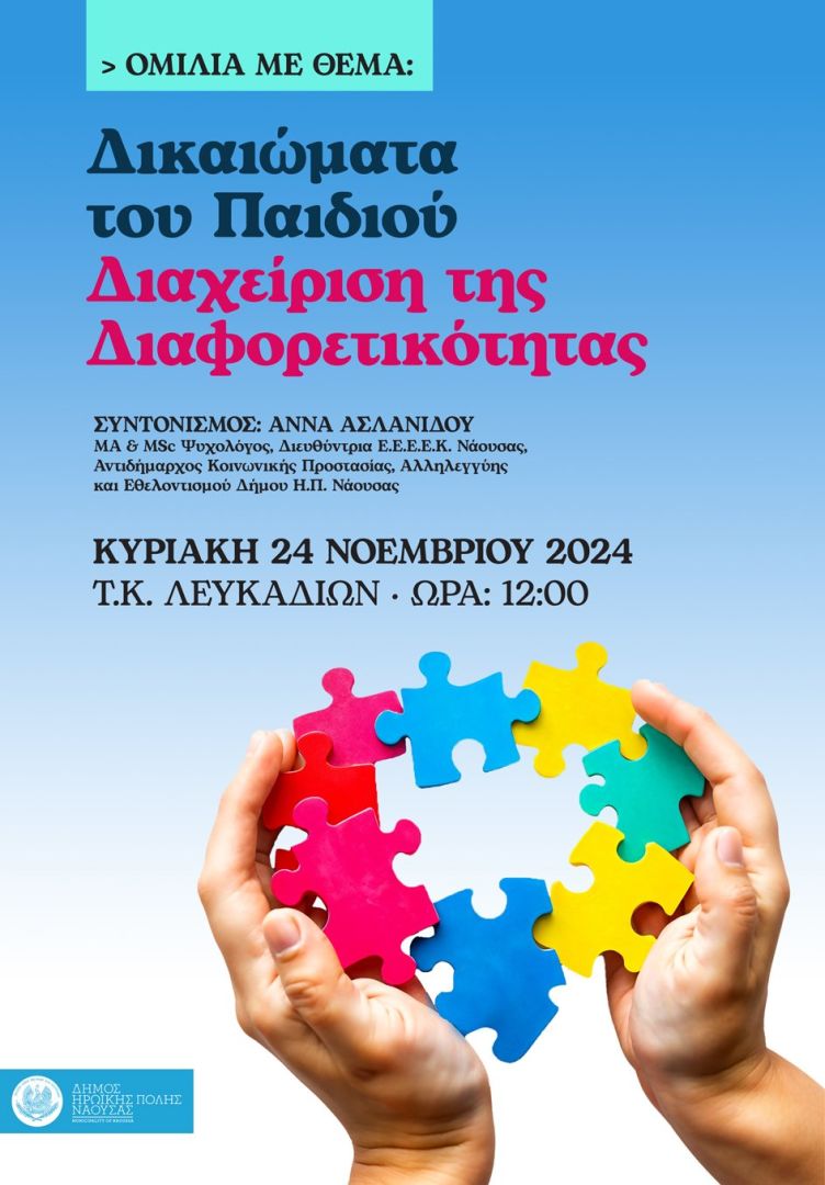 Η Δημοτική Κοινότητα Λευκαδίων σε συνεργασία με την Αντιδημαρχία Κοινωνικής Προστασίας, Αλληλεγγύης και Εθελοντισμού, σας προσκαλούν την Κυριακή 24 Νοεμβρίου στις 12.00 μμ στο κοινοτικό κατάστημα Λευκαδίων σε ανοιχτή συζήτηση με θέμα: “Δικαιώματα του Παιδιού – Διαχείριση της Διαφορετικότητας”.
