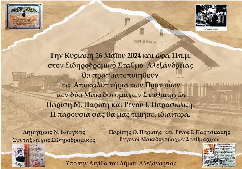 Την Κυριακή 26 Μαϊου 2024 στις 11 π.μ. στον Σιδηροδρομικό Σταθμό Αλεξάνδρειας θα πραγματοποιηθούν τα Αποκαλυπτήρια των Προτομών των δύο Μακεδονομάχων Σταθμαρχών Παρίση Μ. Παρίση και Ρένου Ι. Παρασκάκη. Η παρουσία σας θα μας τιμήσει ιδιαίτερα.