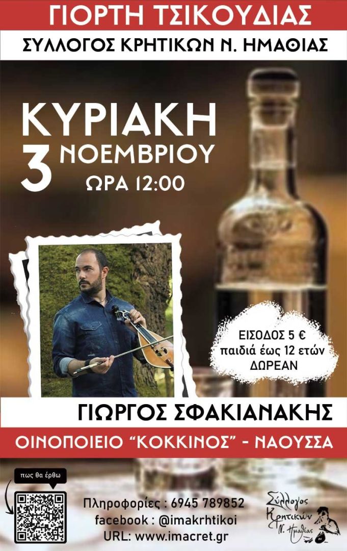 Ο Σύλλογος Κρητικών Νομού Ημαθίας σας προσκαλεί την Κυριακή 3 Νοεμβρίου και ώρα 12.00 μ.μ., στη 16η γιορτή τσικουδιάς, στο οινοποιείο «ΚΟΚΚΙΝΟΣ» στη Νάουσα.