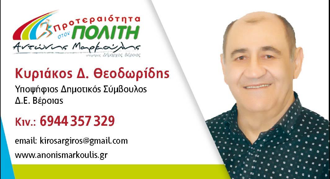 Συμμετέχω στις Δημοτικές εκλογές της 26 Μαΐου 2019 , με τον συνδυασμό ΠΡΟΕΤΕΡΑΙΟΤΗΤΑ ΣΤΟΝ ΠΟΛΙΤΗ και τον ΑΝΤΩΝΗ ΜΑΡΚΟΥΛΗ . συνεχίζοντας την παρουσία μου στην Τοπική Αυτοδιοίκηση στο πλευρό του πολίτη, του συμπολίτη που υπηρέτησα αταλάντευτα για 33 χρόνια σαν υπηρεσιακός παράγοντας, ως Γραμματέας της Κοινότητας Γεωργιανών, προϊστάμενος στο Κ.Ε.Π. του Δήμου Βέροιας, προϊστάμενος στο Τμήμα Δημοτικής κατάστασης του Δήμου Βέροιας (Δημοτολόγιο – Ληξιαρχείο) και ως συνδικαλιστής στο σωματείο των συναδέλφων μου Κοινοτικών και Δημοτικών Υπαλλήλων.