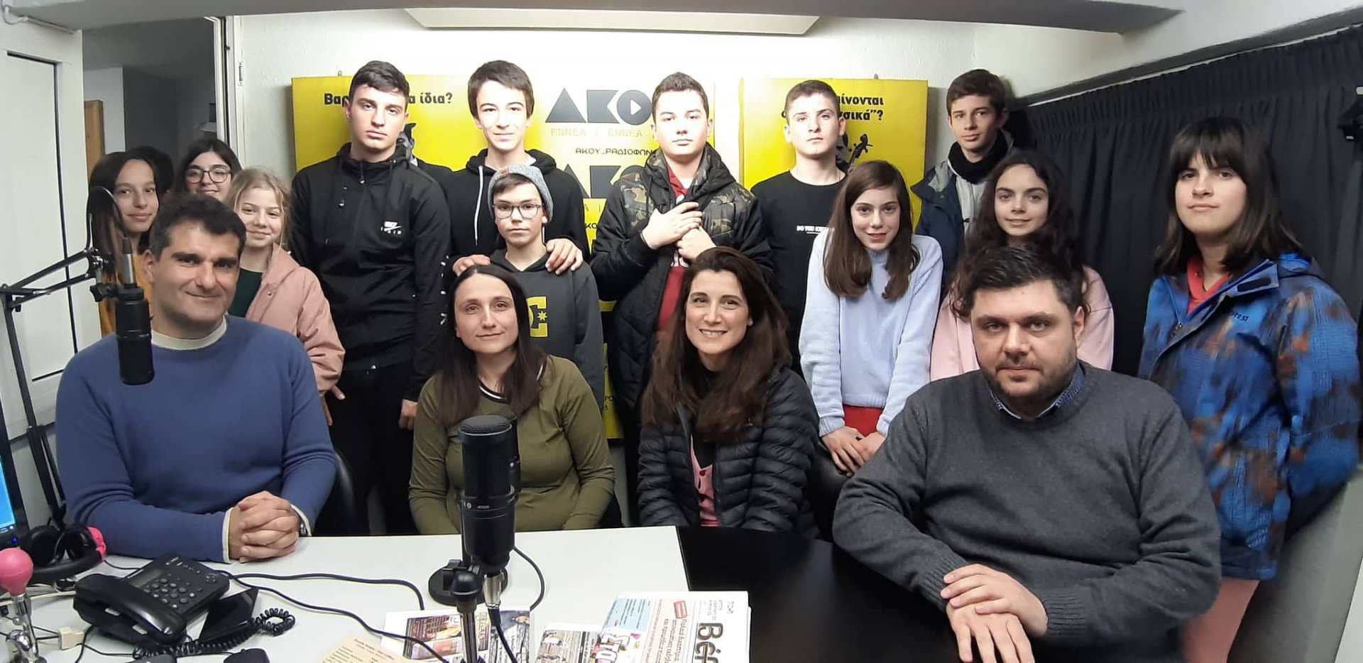 – Μαθητές του 1ου Γυμνασίου Βέροιας μέλη της ομάδας european school radio, συνοδευόμενοι από την Νίνα Ράμου καθηγήτρια μουσικής και Πολύμνια Ανδρεάδου μαθηματικό, ζωντανά στο στούντιο του ΑΚΟΥ 99.6, δίνουν πληροφορίες για το πρόγραμμα που συμμετέχουν και ξεναγούνται στην… μαγεία του Ραδιοφώνου