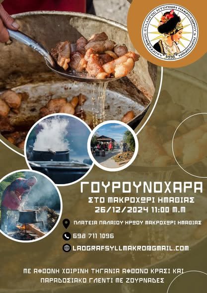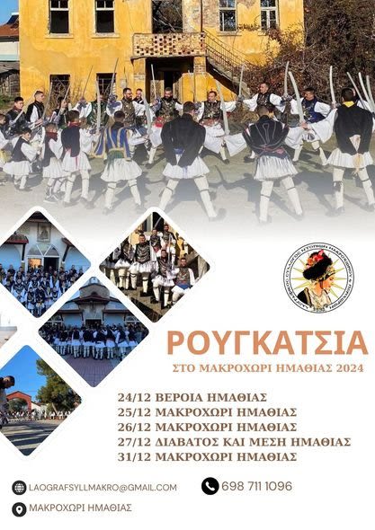 Ο Λαογραφικός Σύλλογος Ντόπιων Μακροχωρίου και Περιχώρων με μεγάλη χαρά ανακοινώνει το πρόγραμμα των εορταστικών εκδηλώσεων για την αναβίωση του εθίμου “Ρουγκάτσια” και της παραδοσιακής “Γουρουνοχαράς”, οι οποίες φέτος συμπληρώνουν 31 χρόνια συνεχούς αναβίωσης.