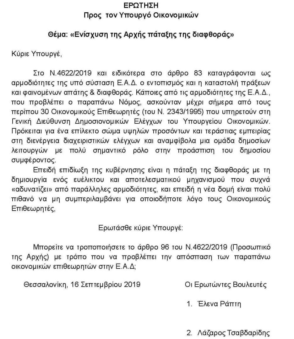Διευκρινήσεις αναφορικά με τους τρόπους βέλτιστης δυνατής στελέχωσης της νεοϊδρυθείσας τον Νόμο για το Επιτελικό Κράτος (ν. 4622/2019) Εθνικής Αρχής Διαφάνειας (ΕΑΔ), ζητώ από τον αρμόδιο Υπουργό Οικονομικών συνυπογράφοντας σχετική Ερώτηση της συναδέλφου μου από τη ΝΔ κ. Έλενας Ράπτη.