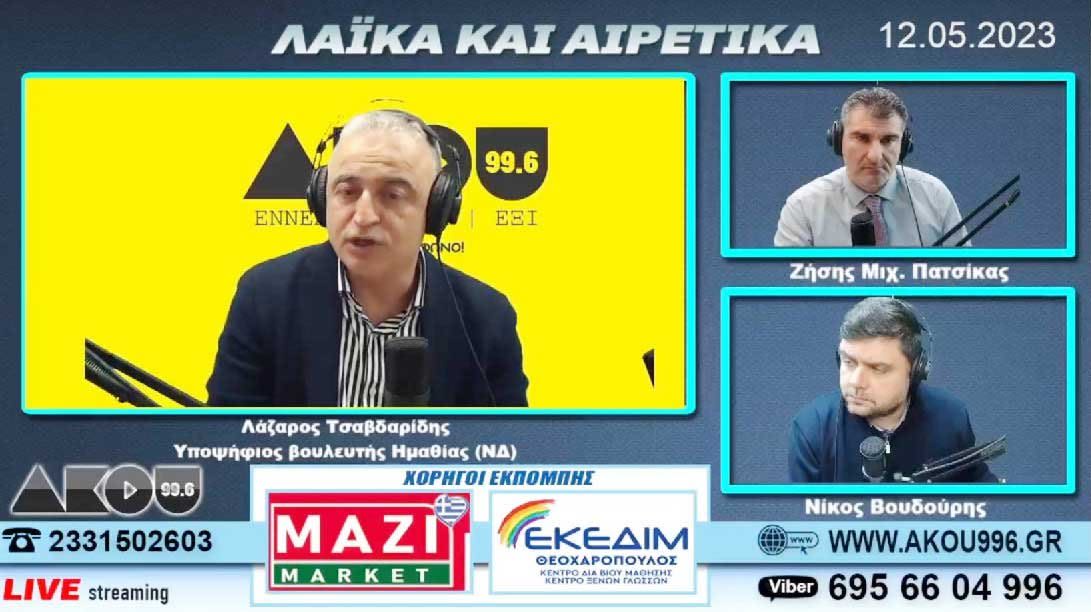 Έναν σύντομο απολογισμό των παρεμβάσεων και των έργων της κοινοβουλευτικής θητείας του έκανε ο υποψήφιος βουλευτής Ημαθίας της Ν.Δ. Λάζαρος Τσαβδαρίδης, μιλώντας στους Ζήση Μιχ. Πατσίκα και Νίκο Βουδούρη στην ραδιοφωνική εκπομπή Λαϊκά&Αιρετικά του ΑΚΟΥ 99,6. Ο κ. Τσαβδαρίδης εκτός των σημαντικών παρεμβάσεων για τους αγρότες της Ημαθίας, του ορισμού του ως γενικού εισηγητή του προϋπολογισμού του 2023, υπογράμμισε την συμμετοχή του σε 3 εξεταστικές επιτροπές που συστάθηκαν,(διαγωνισμός καναλιών με Παππά και Καλογρίτσα, Λίστα Πέτσα και υπόθεση υποκλοπών Ανδρουλάκη), στην τελευταία μάλιστα ήταν και γενικός εισηγητής της Ν.Δ.