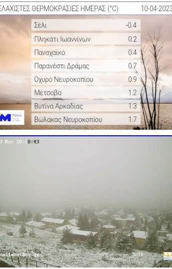 Ο Απρίλιος δεν μας έχει δείξει ακόμη τον ανοιξιάτικο χαρακτήρα του, τουναντίον βγάλαμε πάλι στην επιφάνεια χειμωνιάτικα ρούχα αφού το κρύο και η βροχή μόνο Πασχαλιά δεν θυμίζει. Αποκορύφωμα το χιόνι που έπεσε στο Σέλι, με τον υδράργυρο να φτάνει τα ξημερώματα της Μ. Δευτέρας τους -0,4 βαθμούς, σημειώνοντας πανελλαδική χαμηλότερη θερμοκρασία.