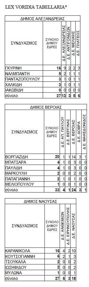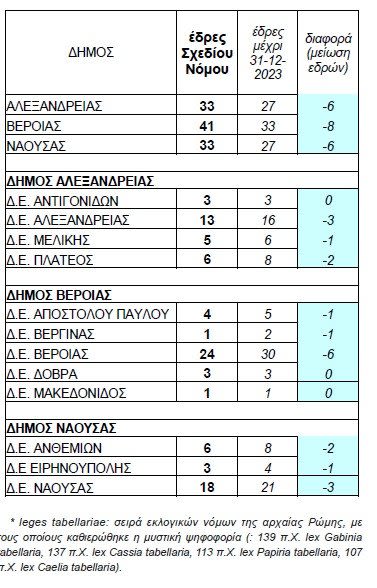 Σε μια πρώτη προσέγγιση των νέων δεδομένων και αλλαγών, παρουσιάζεται στους Πίνακες η κατανομή των εδρών των Δημοτικών Συμβουλίων Αλεξάνδρειας, Βέροιας και Νάουσας [ανά συνδυασμό, τόσο στο σύνολο του κάθε Δήμου όσο και ανά Δημοτική Ενότητα (εκλογική περιφέρεια)], όπως αυτή η κατανομή θα προέκυπτε αν στα εκλογικά αποτελέσματα του 2019 εφαρμοζόταν το εκλογικό σύστημα που καθιερώνεται με το υπό διαβούλευση Σχέδιο Νόμου του Υπουργείου Εσωτερικών. Το Σχέδιο Νόμου, όπως τελικά θα διαμορφωθεί, προβλέπεται να ισχύσει στις προσεχείς αυτοδιοικητικές εκλογές, που ορίζει πως θα διεξαχθούν την δεύτερη Κυριακή του Οκτωβρίου 2023 ( 08-10-2023).