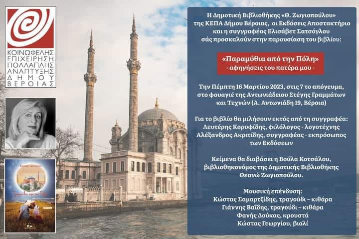 Ζωγιοπούλου» της ΚΕΠΑ Δήμου Βέροιας, οι Εκδόσεις Αποστακτήριο και η συγγραφέας Ελισάβετ Σατσόγλου σάς προσκαλούν στην παρουσίαση του βιβλίου: «Παραμύθια από