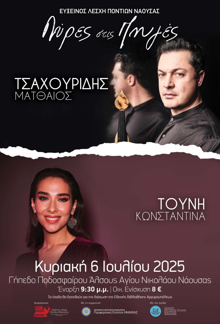 Οι Λύρες στις Πηγές επιστρέφουν για 7η χρονιά από την Εύξεινο Λέσχη Ποντίων Νάουσας, αυτή την φορά στο Γήπεδο Ποδοσφαίρου του Άλσους Αγίου Νικολάου Νάουσας, την Κυριακή 6 Ιουλίου 2025.