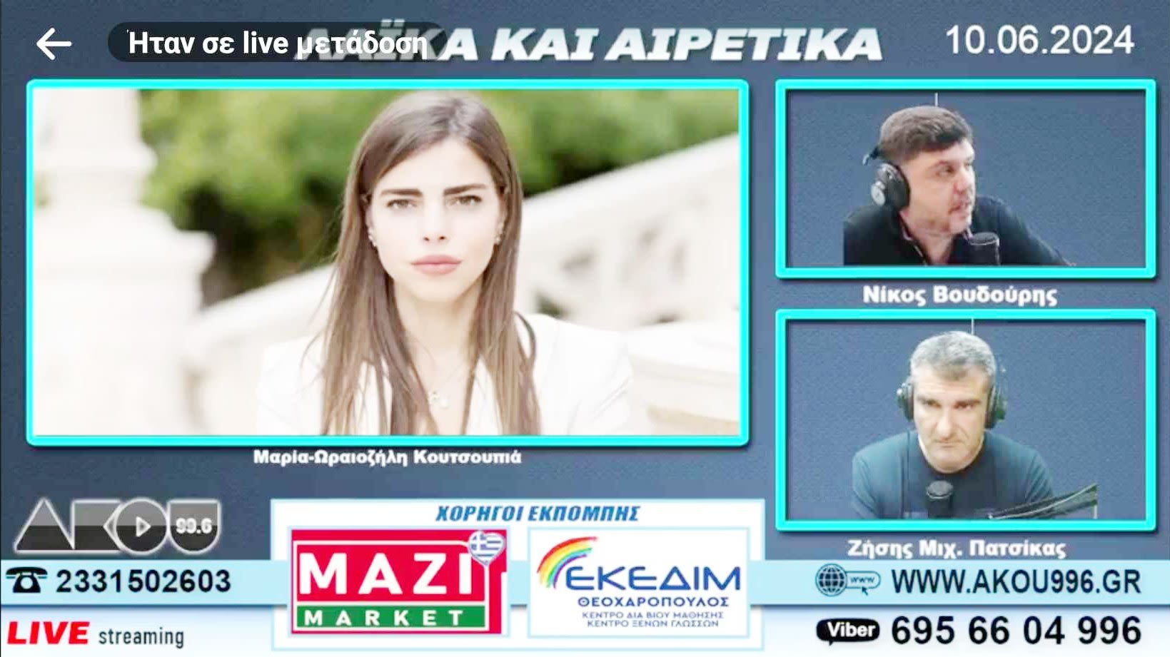 Τις ευχαριστίες της προς τους ημαθιώτες εξέφρασε η υποψήφια ευρωβουλευτής της Ν.Δ. Μαρία-Ωραιοζήλη Κουτσουπιά μέσα από την ραδιοφωνική εκπομπή Λαϊκά&Αιρετικά του ΑΚΟΥ 99,6 το μεσημέρι της Δευτέρας(10/6/2024). Η κα Κουτσουπιά μιλώντας με τους Ζήση Μιχ. Πατσίκα και Νίκο Βουδούρη ευχαρίστησε τους ψηφοφόρους της Ημαθίας που την κατέταξαν πρώτη στο νομό, αλλά η 18η θέση που έλαβε συνολικά στο ψηφοδέλτιο της Ν.Δ. μπορεί να είναι μια καλή πρώτη εμφάνιση, ωστόσο δεν εκλέγεται όπως θα ήταν το επιθυμητό για να βοηθήσει ως ευρωβουλευτής στις Βρυξέλλες.