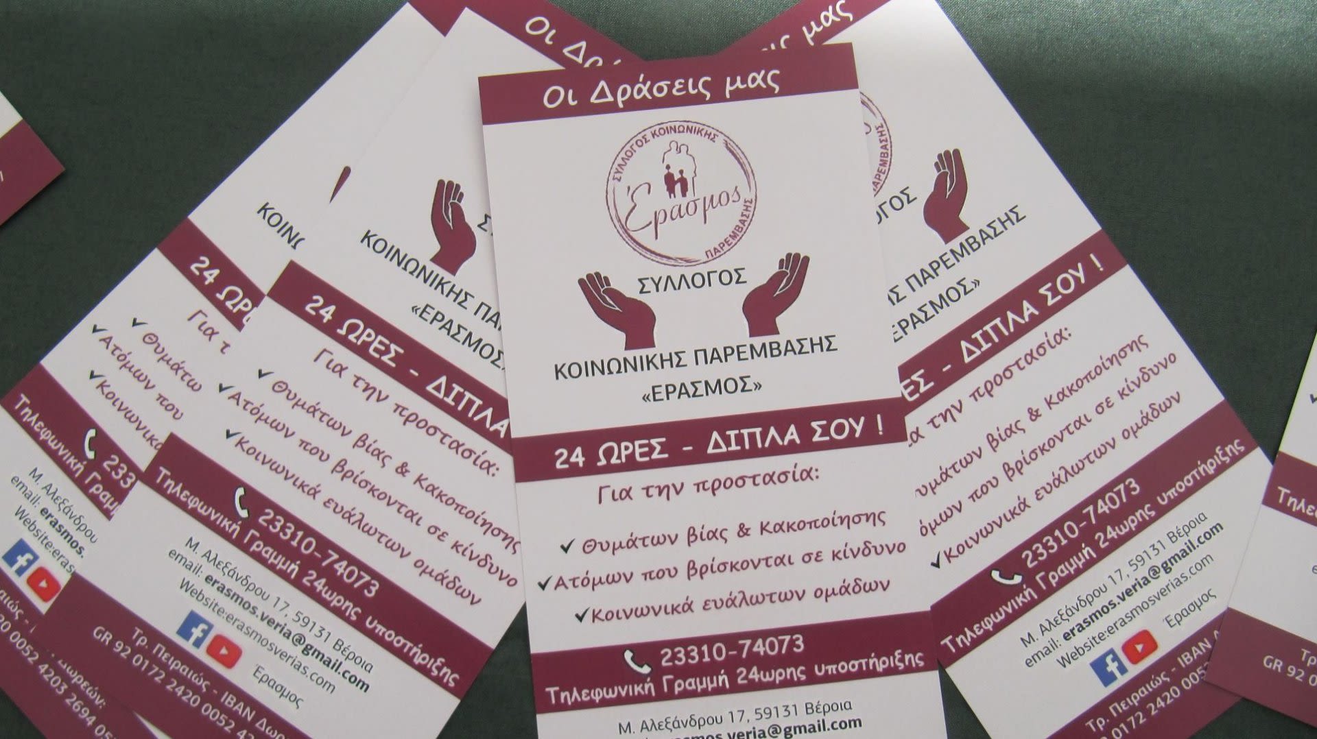 Σημαντική επιτυχία σημείωσε η διοργάνωση ενημερωτικής και αφυπνιστικής δράσης του Συλλόγου Κοινωνικής Παρέμβασης «Έρασμος» στην Πλατεία Δημαρχείου της Βέροιας, το πρωί της Παρασκευής 25 Νοεμβρίου – Διεθνούς Ημέρας για την Εξάλειψη της βίας κατά των γυναικών, με τη συμμετοχή μαθητών και εκπαιδευτικών του Εργαστηριακού Κέντρου Βέροιας, του 1ου ΕΠΑΛ, του Εσπερινού Εσπερινού ΕΠΑΛ, του ΕΝΕΕΕΓΥΛ και της Οργάνωσης Α21 από τη Θεσσαλονίκη, κατά της Σωματεμπορίας.