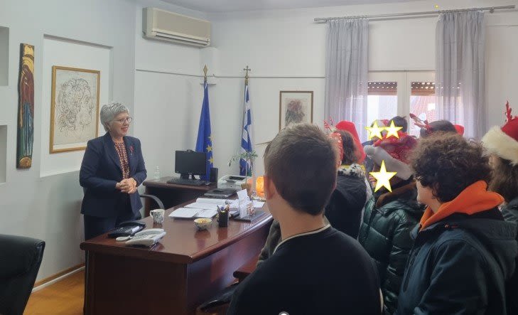 Σήμερα, Παρασκευή 23/12/2022, οι μαθητές της ΣΤ’ τάξης του 1ου Δημοτικού Σχολείου Βέροιας, συνοδευόμενοι από τη Διευθύντρια, Μαρία Διαμαντοπούλου, και την εκπαιδευτικό , Πετρούλα Πρόιου, έψαλλαν τα Χριστουγεννιάτικα Κάλαντα στη Διεύθυνση Α/θμιας Εκπαίδευσης.