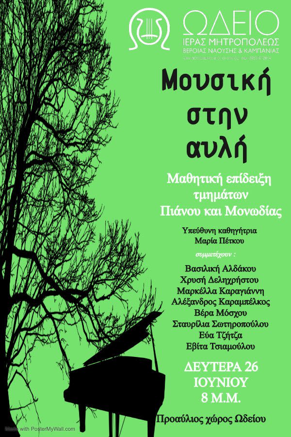 Την Δευτέρα 26 Ιουνίου 2023 και ώρα 8:00 μ.μ. στον προαύλιο χώρο του Ωδείου της Μητρόπολης θα πραγματοποιηθεί Μαθητική Επίδειξη Πιάνου και Μονωδίας των σπουδαστών της τάξης κ. Μαρίας Πέτκου, η οποία και ανέλαβε την όλη διοργάνωση, επιμέλεια και παρουσίαση της εκδήλωσης.