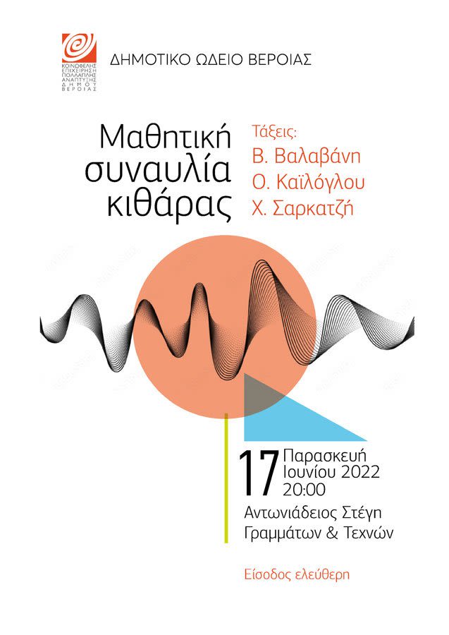 Προχωρημένοι αλλά και νέοι μαθητές των τμημάτων κιθάρας του Δημοτικού Ωδείου Βέροιας, στα πλαίσια των εκπαιδευτικών δραστηριοτήτων της σχολικής χρονιάς 2021-2022 θα παρουσιάσουν σήμερα 17 Ιουνίου 2022, στις 8:00 το απόγευμα, στην Αντωνιάδειο Στέγη Γραμμάτων και Τεχνών τα έργα που ετοίμασαν .