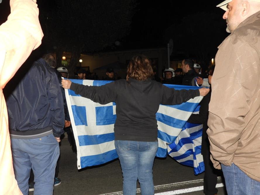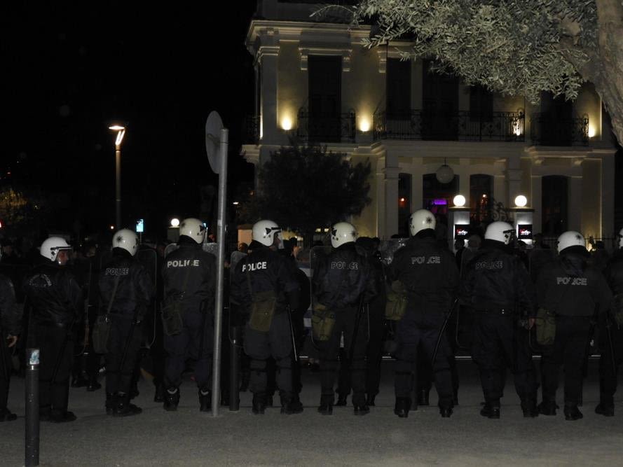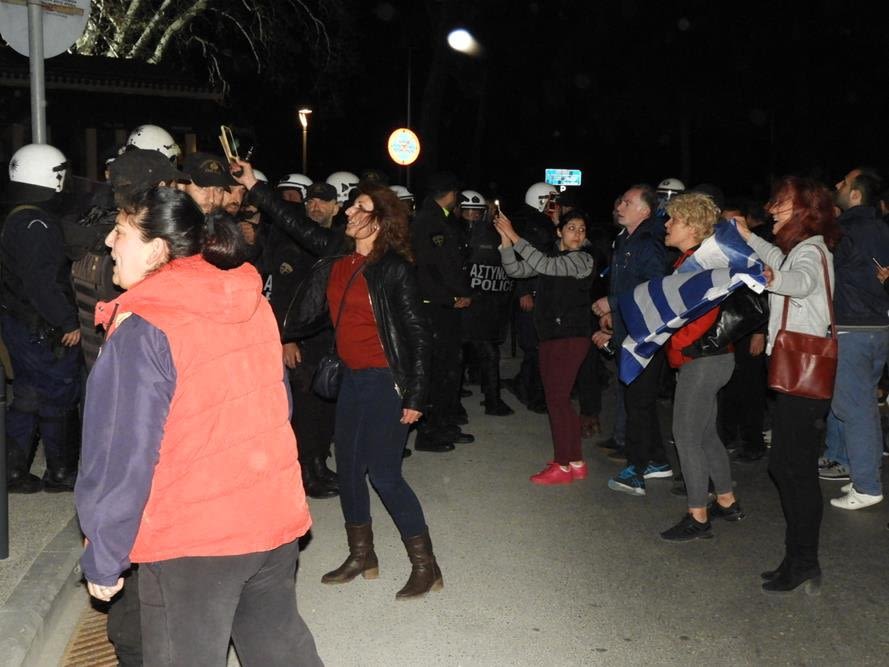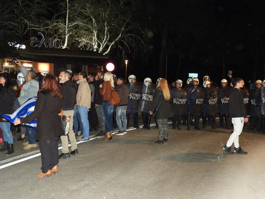 Ισχυρή ομάδα των ΜΑΤ κρατούσε τους διαμαρτυρόμενους σε απόσταση ασφαλείας από την αίθουσα όπου μίλησε ο υπουργός λίγο μετά τις 8.00 το βράδυ, ενώ έξω από την αίθουσα ακουγόταν το «Μακεδονία ξακουστή» και υβριστικά συνθήματα εναντίον της κυβέρνησης.