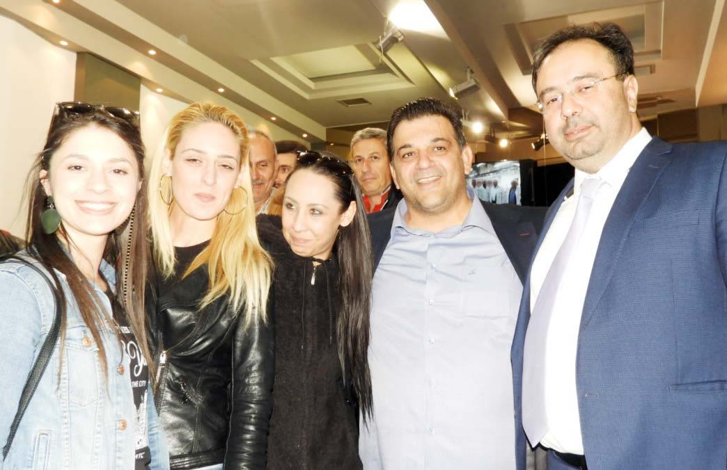Κ. Βοργιαζίδης, Αργύρης Σακαλής και τρία γλυκά κορίτσια του ζαχαροπλαστείου «ΤΡΙΓΩΝΟ» χαμογελούν στο φακό του «Λαού» μετά τα εγκαίνια του εκλογικού κέντρου του συνδυασμού «Δράση με Γνώση», το βράδυ της περασμένης Τετάρτης.