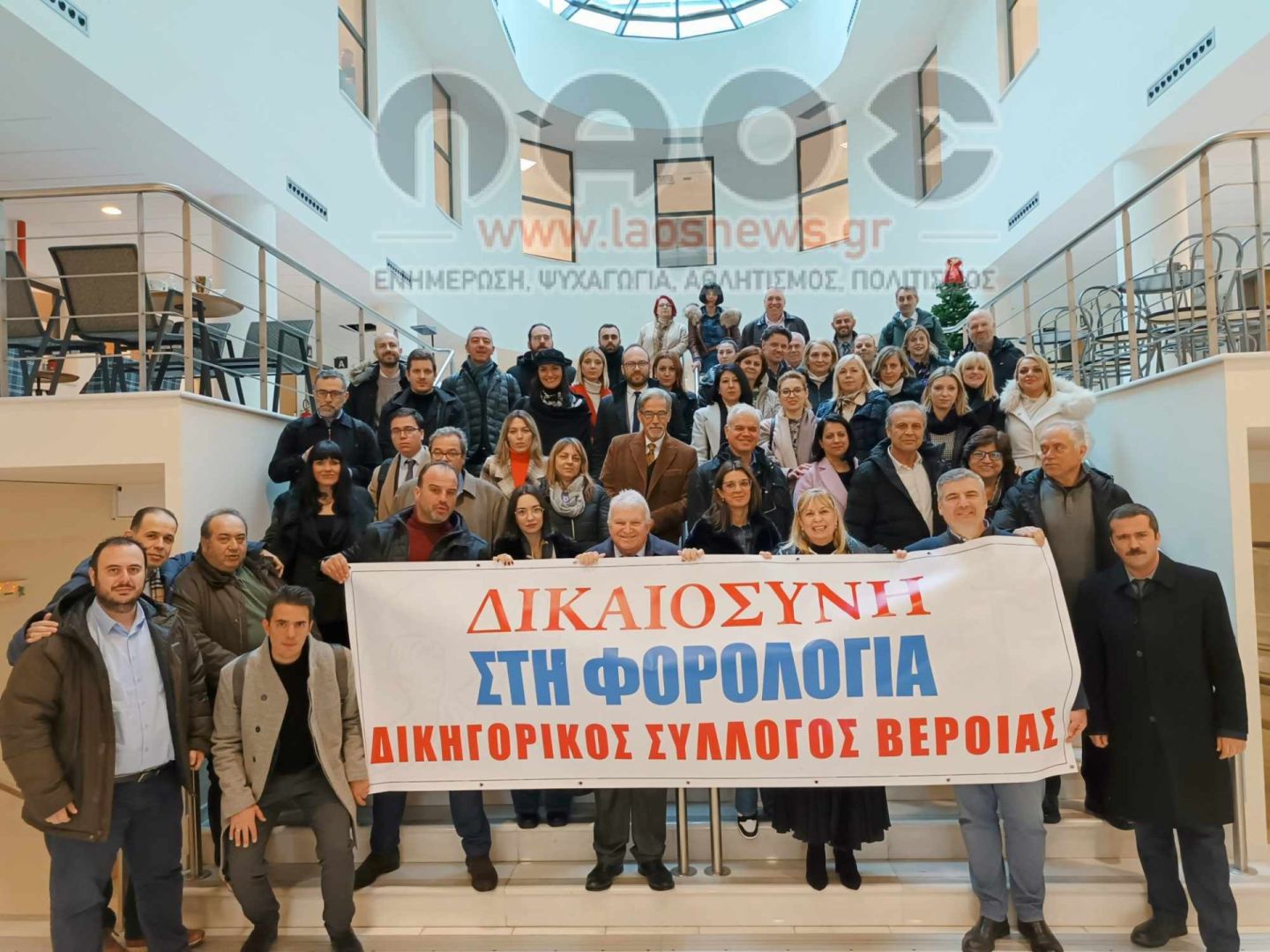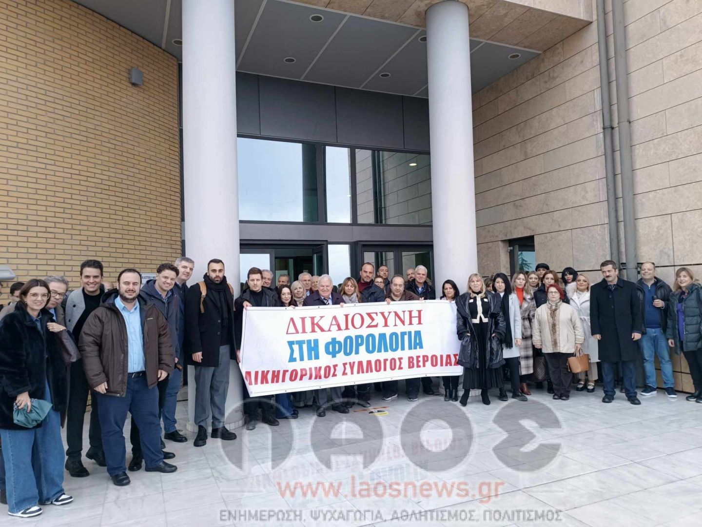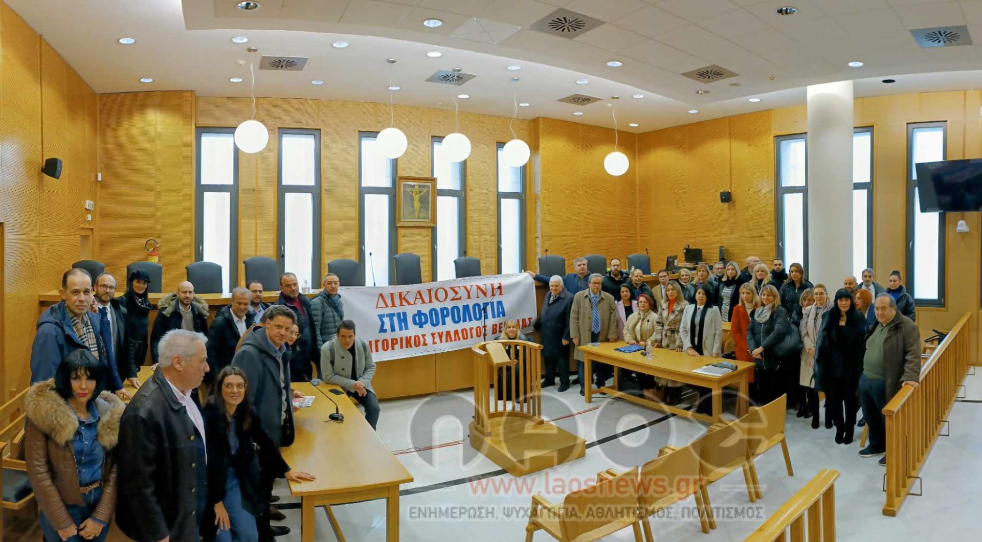 Στην συμβολική κατάληψη του Δικαστικού Μεγάρου Βέροιας προχώρησαν χθες (Τετάρτη 06/12) το μεσημέρι τα μέλη του Δικηγορικού Συλλόγου Βέροιας, διαμαρτυρόμενοι για το φορολογικό νομοσχέδιο. Συγκεκριμένα στις 12 το μεσημέρι μετά το κάλεσμα του Δ.Σ. του συλλόγου τουλάχιστον 50-60 δικηγόροι από όλη την Ημαθία συγκεντρώθηκαν στην κεντρική είσοδο του Δικαστικού Μεγάρου Βέροιας και ανήρτησαν ένα πανό με το μήνυμα «ΔΙΚΑΙΟΣΥΝΗ ΣΤΗ ΦΟΡΟΛΟΓΙΑ».