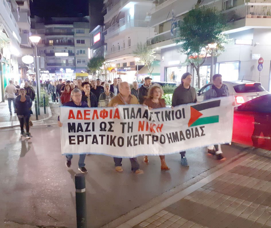 Τη συμπαράστασή τους στον αγώνα του λαού της Παλαιστίνης εξέφρασαν χθες το απόγευμα από την πλατεία Εληάς της Βέροιας, το Νομαρχιακό Τμήμα της ΑΔΕΔΥ Ημαθίας και το Εργατικό Κέντρο Ημαθίας «Γιώργος Βουτυράς», σε κοινό συλλαλητήριο που διοργάνωσαν με κεντρικό σύνθημα: «Αδέλφια Παλαιστίνιοι μαζί ως τη νίκη», ζητώντας να σταματήσει κάθε οικονομική, πολιτική, στρατιωτική συνεργασία με το κράτος του Ισραήλ και να αναγνωριστεί άμεσα το παλαιστινιακό κράτος. Μετά την κεντρική συγκέντρωση ακολούθησε πορεία στο κέντρο της πόλης.