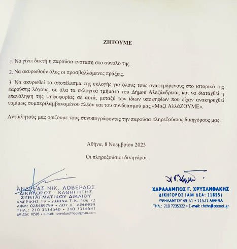 Το πρωί της Δευτέρας (13/11) η επικεφαλής του συνδυασμού «μαζί αλλάΖΟΥΜΕ» Δώρα Κουρκουτά προσήλθε στην Γραμματεία του Πρωτοδικείου Βέροιας, όπου κατέθεσε ένσταση κατά του αποκλεισμού του συνδυασμού της από τις πρόσφατες εκλογές για την διεκδίκηση του δήμου Αλεξάνδρειας. Να θυμίσουμε ότι στα τέλη Σεπτέμβρη ο συνδυασμός Κουρκουτά είχε καταθέσει ασφαλιστικά μέτρα που ζητούσε ανάκληση της απόφασης ανακήρυξης των συνδυασμών που τους είχε αφήσει εκτός εκλογών, αλλά είχε απορριφθεί η αίτηση.
