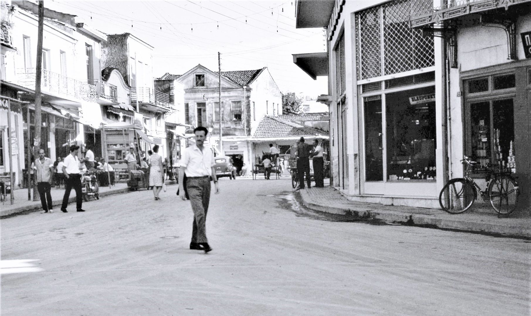 Οδός Κεντρικής, έτος 1965. Το περίπτερο (του Φιλόσογλου) αριστερά παραμένει ακόμη. Στο βάθος ο δρόμος διασταυρώνεται με την οδό Μεγάλου Αλεξάνδρου. Η φωτογράφηση έγινε από την πλατεία Αγίου Αντωνίου. Μια πόλη χωρίς πολλά αυτοκίνητα. Συνύπαρξη το κάρο, το ποδήλατο, ο σκαραβαίος, το θρυλικό κατσαριδάκι.