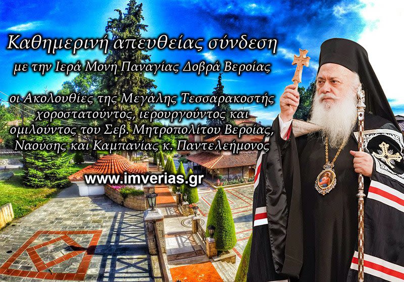 Καθημερινά μεταδίδονται απευθείας οι Ιερές Ακολουθίες της Αγίας και Μεγάλης Τεσσαρακοστής από το καθολικό της Ιεράς Μονής Παναγίας Δοβρά Βεροίας, χοροστατούντος, ιερουργούντος και ομιλούντος του Σεβασμιωτάτου Μητροπολίτου μας κ. Παντελεήμονος σύμφωνα με το εξής πρόγραμμα: