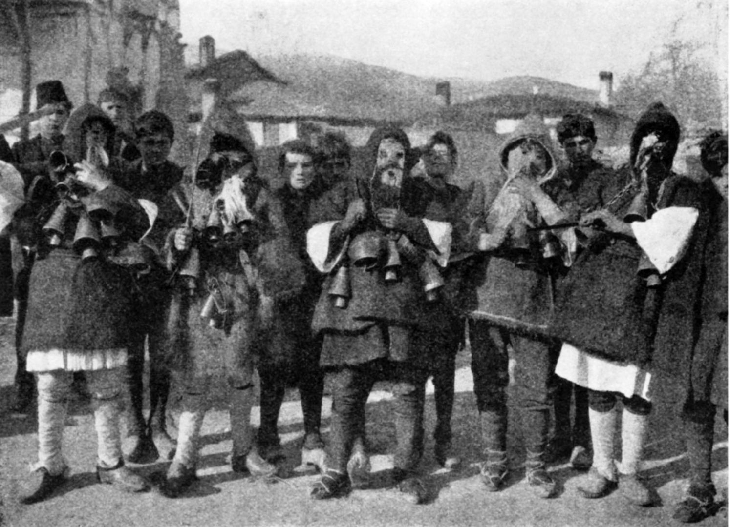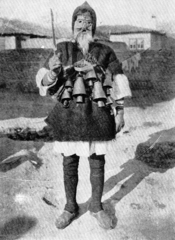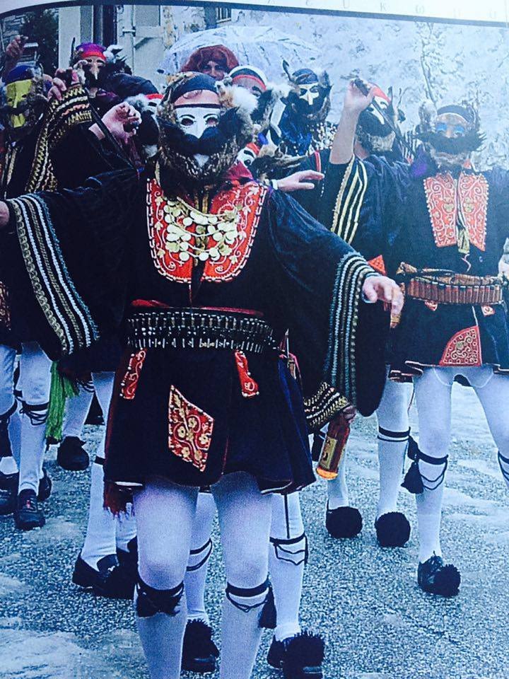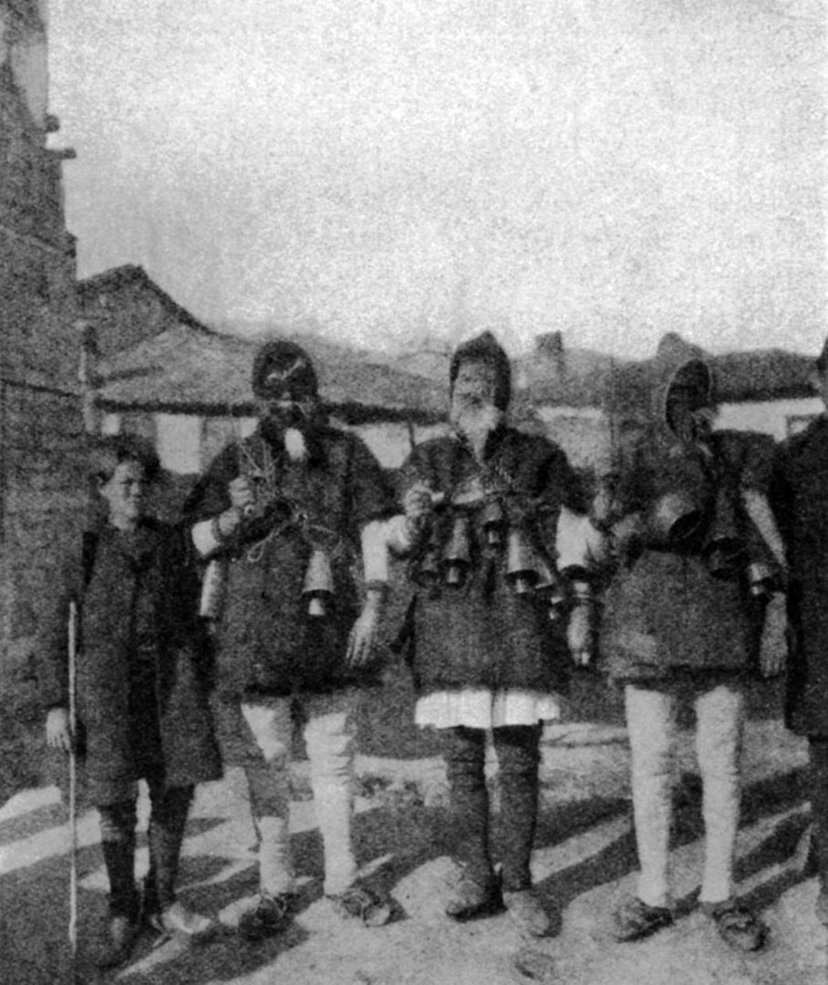 «…Στο Δωδεκαήμερο δημιουργείται ένας θίασος με ηθοποιούς με σκοπό να διώξει τους καλικάντζαρους. Οι ομάδες αυτές έπαιζαν το ‘έργο’ τους σε όλα τα γειτονικά χωριά από την Πρωτοχρονιά μέχρι τα Θεοφάνεια. Εάν συναντιώνταν δυο τέτοιες ομάδες, υπήρχε συναγωνισμός για το ποια ομάδα ήταν καλύτερη, που μπορεί να έφτανε ακόμα και σε πραγματική αιματοχυσία. Οι βασικοί χαρακτήρες της κάθε ομάδας ήταν επτά: η νύφη, ο γαμπρός, η γριά, ο αράπης ή ο γέρος, ο γιατρός και δυο άντρες ντυμένοι με δέρματα, παριστάνοντας αρκούδες. Ο αράπης και οι δυο άντρες έφεραν επίσης κουδούνια. Όλοι ήταν άντρες!