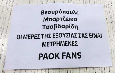Πήραμε ένα και διαβάσαμε: «Βεσυρόπουλε, Μπαρτζώκα, Τσαβδαρίδη οι μέρες της εξουσίας σας είναι μετρημένες. PAOK FANS».