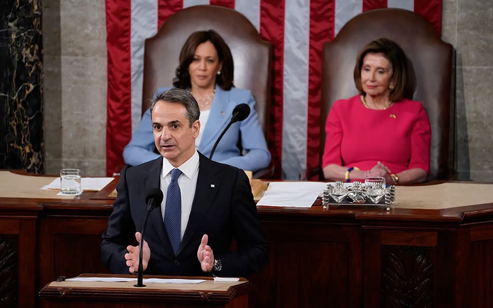 Συνεχίζοντας, ο πρωθυπουργός αναφέρθηκε στους δεσμούς Ελλάδας-ΗΠΑ από την εποχή της Ελληνικής Επανάστασης μέχρι τις μέρες μας: «Αντικαταστήστε την λέξη Ελλάδα με τη λέξη Ουκρανία και οι ομοιότητες αναδύονται εύγλωττα. Όπως στη Μαριούπολη, έτσι και στο Μεσολόγγι το 1826 οι υπερασπιστές της πόλης απέκρουσαν τη μία επίθεση μετά την άλλη προτού παραδοθούν χάνοντας τη ζωή τους μεταξύ των οποίων και πολλά παιδιά. Ακόμη και σήμερα δεν έχουμε ξεχάσει τους Αμερικανούς εθελοντές που χάρισαν τη ζωή τους στη μάχη για την ελευθερία της Ελλάδος, ούτε και όλους όσοι απέστειλαν ανθρωπιστική βοήθεια. Το πρώτο σχολείο δημιουργήθηκε στην Αθήνα το 1831 από τον αμερικανό Χιλ. Ακόμη και μετά τον Β’ Παγκόσμιο Πόλεμο, το σχέδιο Μάρσαλ βοήθησε την χώρα μας να ορθοποδήσει μετά τις καταστροφές του πολέμου και του εμφυλίου. Έλληνες που σώθηκαν από τον πόλεμο έγιναν συγγραφείς στις ΗΠΑ, πολλοί εξ αυτών μετείχαν ενεργά στον αγώνα κατά της δουλείας».