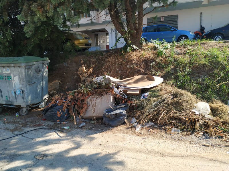 Δίπλα από έναν κάδο απορριμμάτων εδώ και 20 μέρες περίπου, κάποιοι απόθεσαν κλαδιά και ξερόχορτα, που είναι ιδιαιτέρως επίφοβα τέτοια εποχή.