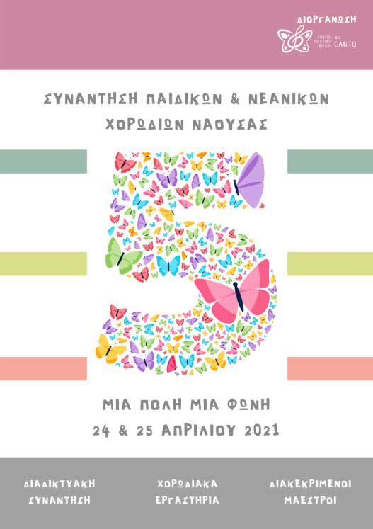 Το διήμερο 24 & 25 Απριλίου 2021 θα πραγματοποιηθεί η 5η Συνάντηση Παιδικών & Νεανικών Χορωδιών Νάουσας Μια Πόλη Μια Φωνή, θεσμός που υλοποιεί ο Σύλλογος Πολιτισμού Νάουσας ενCANTO σε ετήσια βάση από την ίδρυσή του. Καθώς το 2020 η συνάντηση δεν πραγματοποιήθηκε λόγω της πανδημίας, η φετινή διοργάνωση θα υλοποιηθεί εξ ολοκλήρου σε διαδικτυακό περιβάλλον και αισιοδοξεί να αποτελέσει τον χώρο συνάντησης παιδικών και νεανικών χορωδιών, με σκοπό την παρακολούθηση χορωδιακών εργαστηρίων(workshops) από διακεκριμένους μαέστρους και μουσικούς.