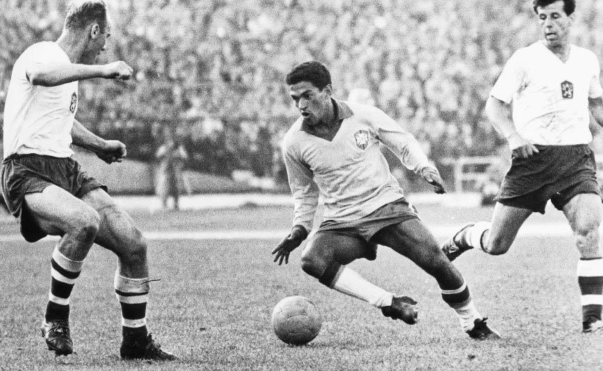 Ο Μανέ Γκαρίντσα φόρεσε τη φανέλα της Εθνικής Βραζιλίας και στο Παγκόσμιο Κύπελλο του 1958, στη Σουηδία, αγωνίστηκε έχοντας συμπαίκτη τον Πελέ. Η Βραζιλία σήκωσε το κύπελλο και οι δύο μαέστροι συμπεριλήφθηκαν στην καλύτερη ενδεκάδα της διοργάνωσης..