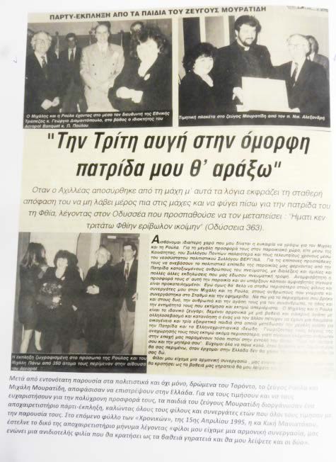 Μετά από εντονότατη παρουσία στα πολιτιστικά και όχι μόνο, δρώμενα του Τορόντο, το ζεύγος Ρούλα και Μιχάλης Μουρατίδη, αποφάσισαν να επιστρέψουν στην Ελλάδα. Για να τους τιμήσουν και να τους ευχαριστήσουν για την πολύχρονη προσφορά τους, τα παιδιά του ζεύγους Μουρατίδη διοργάνωσαν ένα αποχαιρετιστήριο πάρτι-έκπληξη, καλώντας όλους τους φίλους και συνεργάτες ετών που όλοι τους τίμησαν με την παρουσία τους.