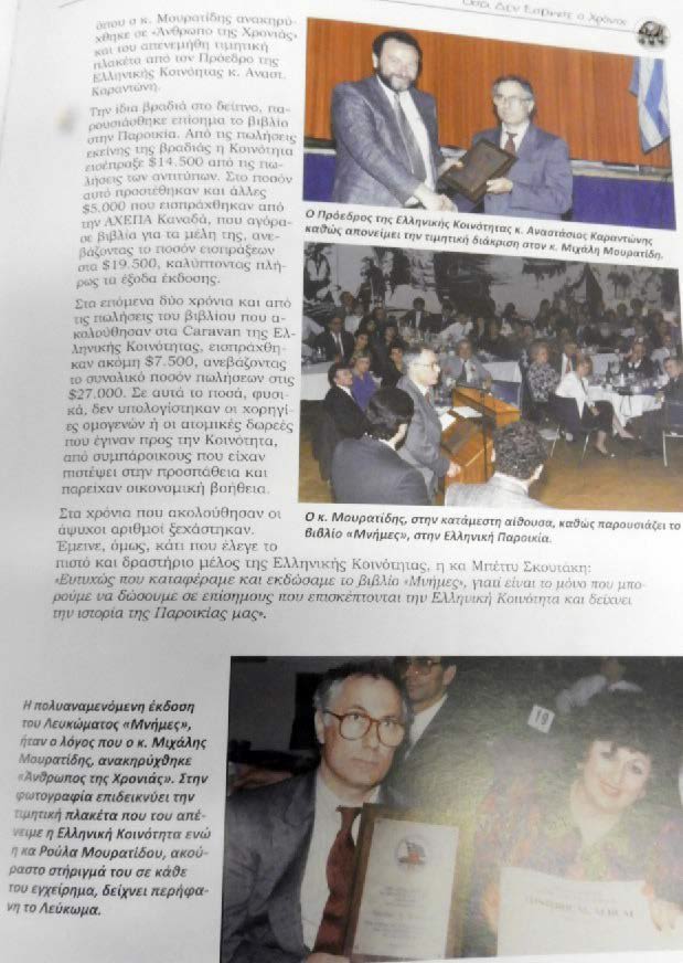 Το 1989, ο Μιχάλης Μουρατίδης ανακηρύχθηκε «Άνθρωπος της χρονιάς» και του απονεμήθηκε τιμητική πλακέτα από τον πρόεδρο της Ελληνικής Κοινότητας Αναστάσιο Καραντώνη για το φωτογραφικό λεύκωμα «Μνήμες» που έγραψε.