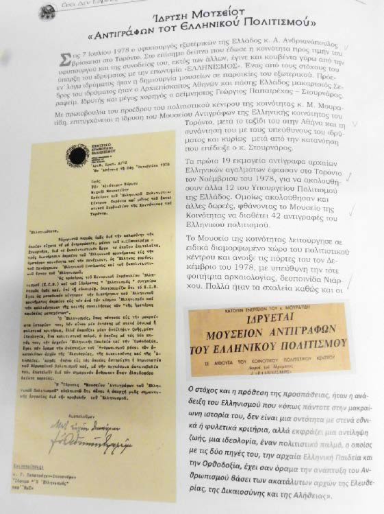 Με πρωτοβουλία του προέδρου του Πολιτιστικού Κέντρου της Κοινότητας Μιχάλη Μουρατίδη, επιτυγχάνεται η ίδρυση του Μουσείου Αντιγράφων της Ελληνικής Κοινότητας του Τορόντο.